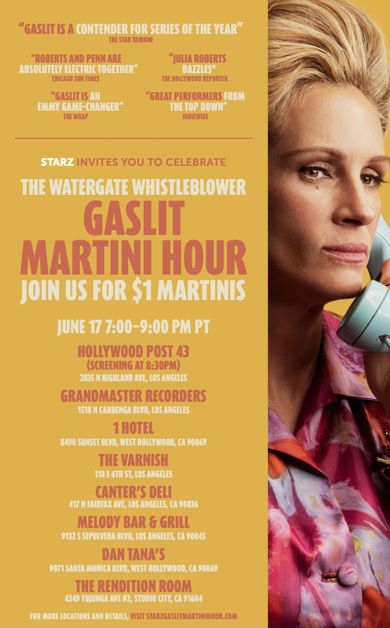 Deets: On the 50th anniversary of Watergate, STARZ invites Angelenos to honor the legacy of Martha Mitchell, the first person to publicly sound the alarm on Nixon’s involvement in the historic political scandal. Celebrate one of the most important whistleblowers of our time by indulging in $1 martinis, Martha’s drink of choice, at various hotspots throughout Los Angeles, and don’t forget to watch Gaslit on STARZ, the limited series starring Julia Roberts as Martha, to see her stunning story unfold.