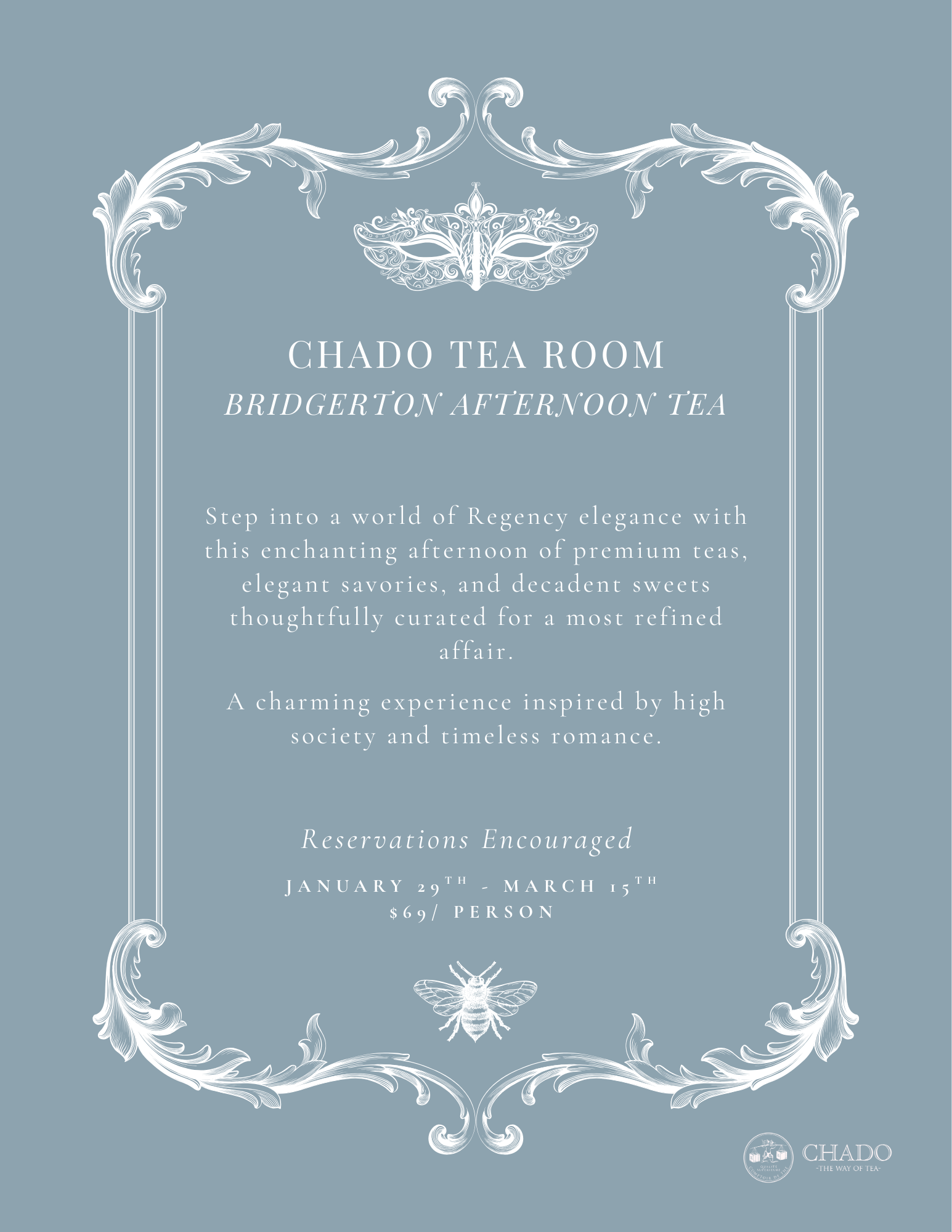 Chado's Bridgerton Afternoon Tea Experience is a charming escape into high society, featuring thoughtfully paired teas and bites designed to be lingered over, savored, and shared in true Regency-inspired fashion.