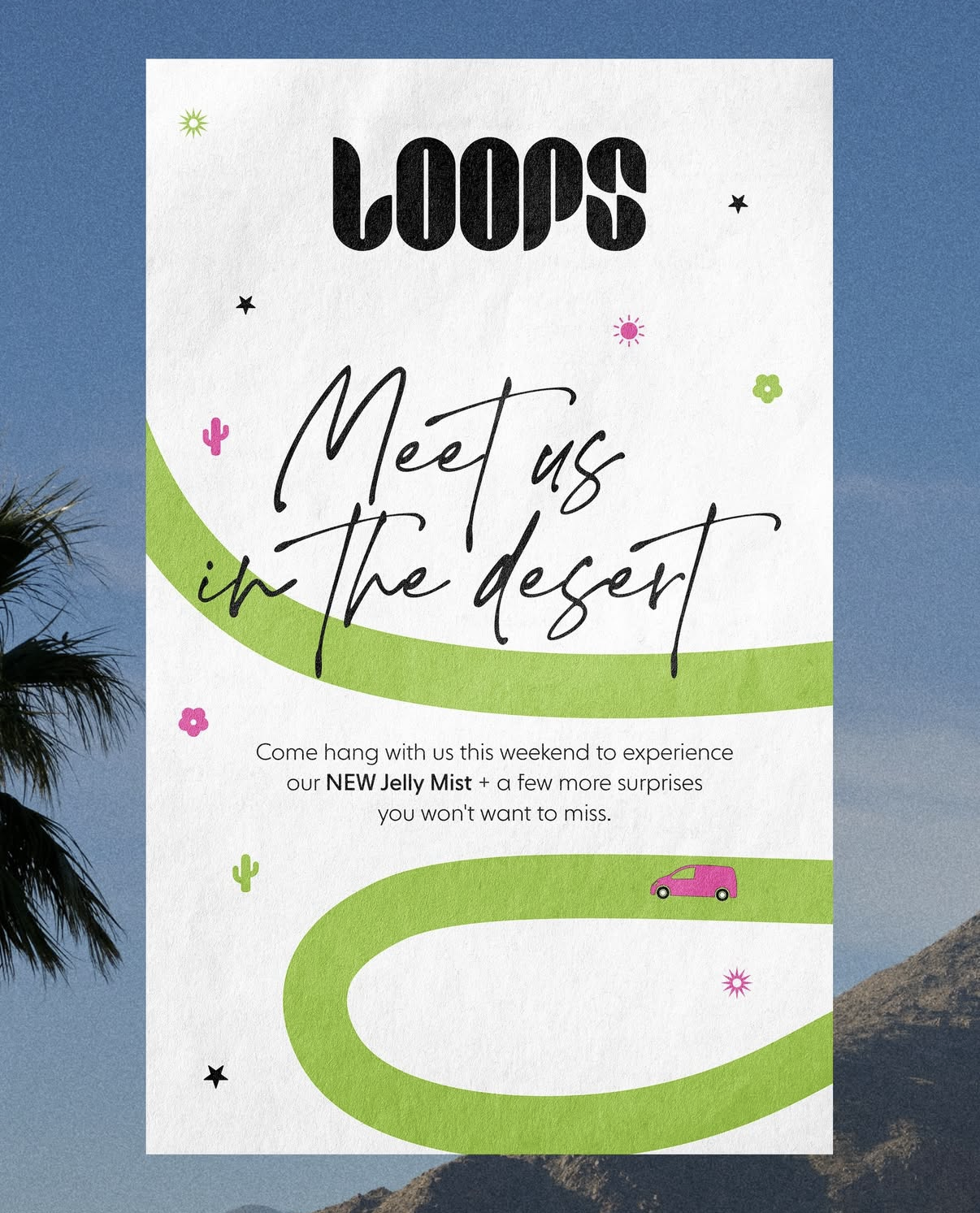 Deets: Meet us in the desert…good times and glowing skin all weekend long. Experience our NEW Jelly Mist + a few more surprises you won’t want to miss. 🌵✨☀️