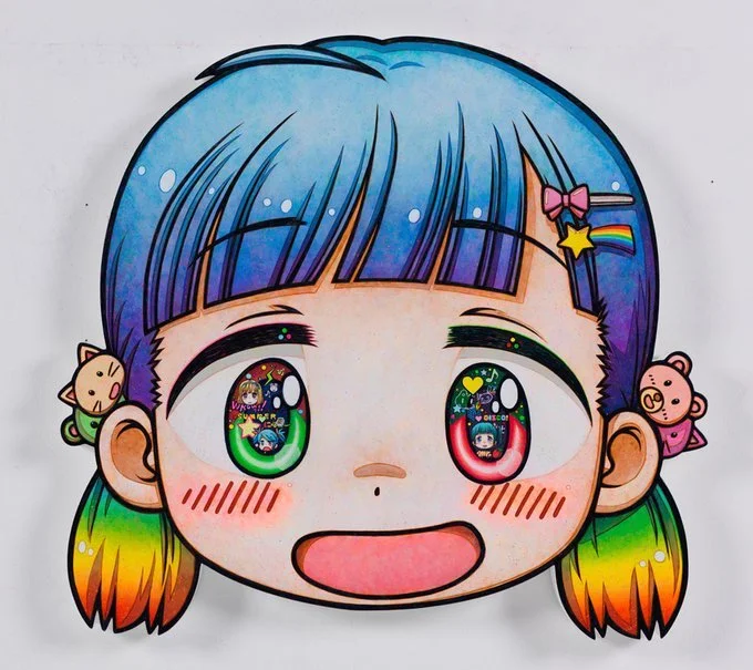 Reflecting his long-standing commitment to critically examining how both images and desire circulate in global internet culture, Beyond the Alley, There… features new, large-scale paintings, shaped head and body paintings, and works on paper. Central to Mr.’s practice is otaku, an increasingly prevalent and popular Japanese subculture of fandom oriented around reclusion and retreat into immersive fantasy worlds, particularly manga and anime. Interested in bridging popular visual and high-art cultures, the artist has compared himself to a translator, positioning anime, manga, and other hallmarks of otaku in the realm of fine art for a global audience. Far from a dispassionate observer, Mr. is himself immersed in otaku culture, and has noted that his works are at times reflections of his personal interests in fantasy and imaginative world-building. As he reinterprets otaku aesthetics for an international art world, Mr. is simultaneously outsider and insider, reporter and diarist.