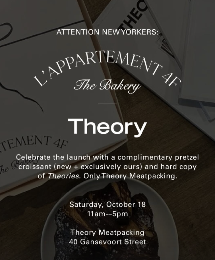 Deets: Celebrate the new Theory magazine: Theories! Join them for a lunch and enjoy a special complimentary pretzel croissant and copy of their first issue!