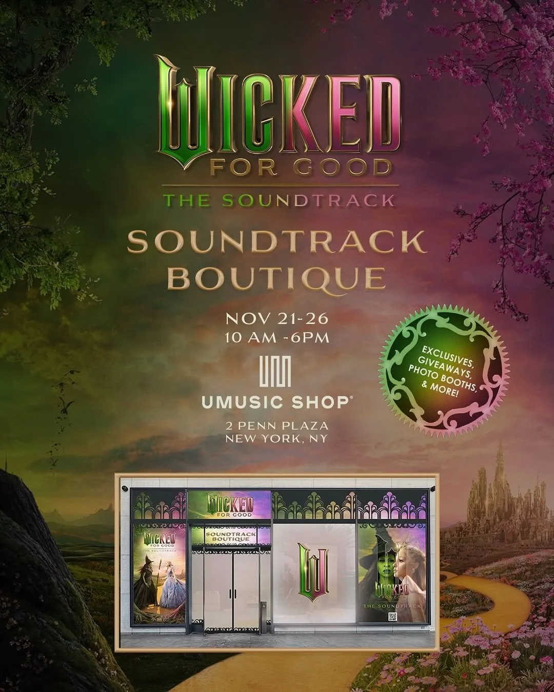Deets: The Wicked: For Good Soundtrack Boutique featuring photos moments, exclusives and replicas of the Grimmerie and Glinda’s Training Wand (that you can enter to win) opens November 21st! ✨