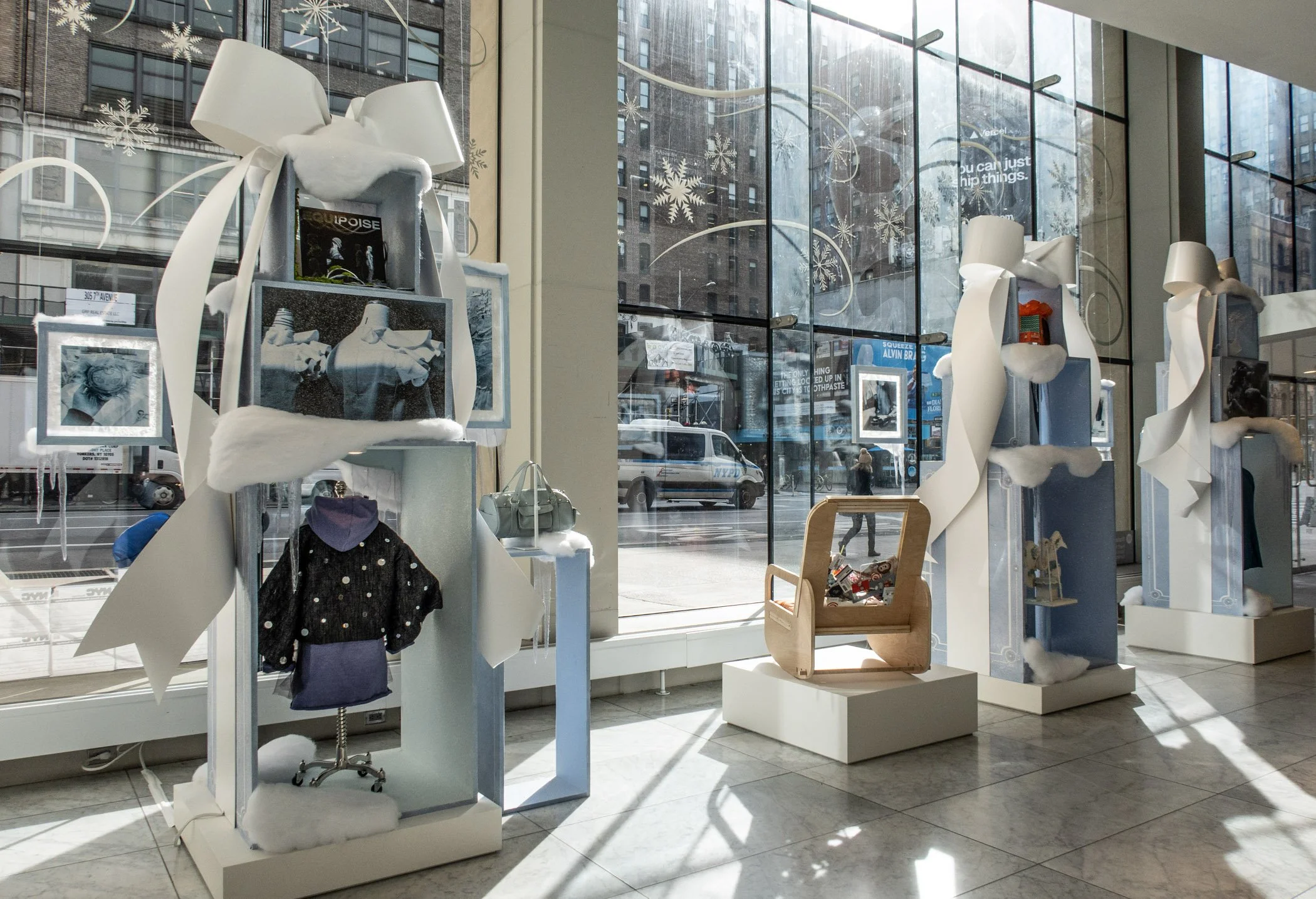 Deets: The Gift of Making transforms the Art and Design Gallery’s windows into a whimsical celebration of creativity and craft. Inspired by the enchantment of holiday displays, the installation invites viewers into a “winter tale” about the joy of designing and making. Each window unfolds as a chapter in this story, featuring student artwork from all 17 majors in the School of Art and Design. Stacked, open-fronted gift boxes serve as cabinets of curiosity, framing the inventive objects, garments, and images that represent the many facets of art and design at FIT. Interwoven with playful ribbons, floating snowflakes, and maker's tools, the displays evoke the shared spirit of creativity and the community of makers behind it.