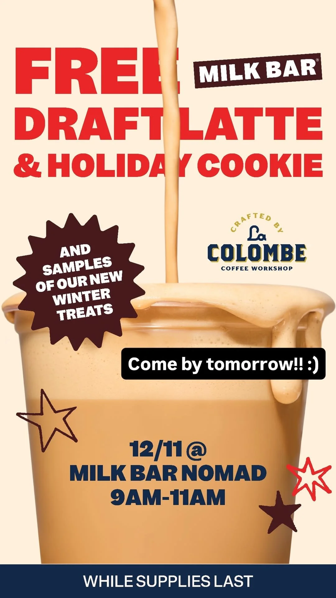 Deets: Head to Milk Bar Nomad on Thursday 12/11 for some holiday cheer! Enjoy a free Draft Latte and Eggnog Cookie on them, lattes crafted by La Colombe. You’ll also enjoy samples of new winter treats.