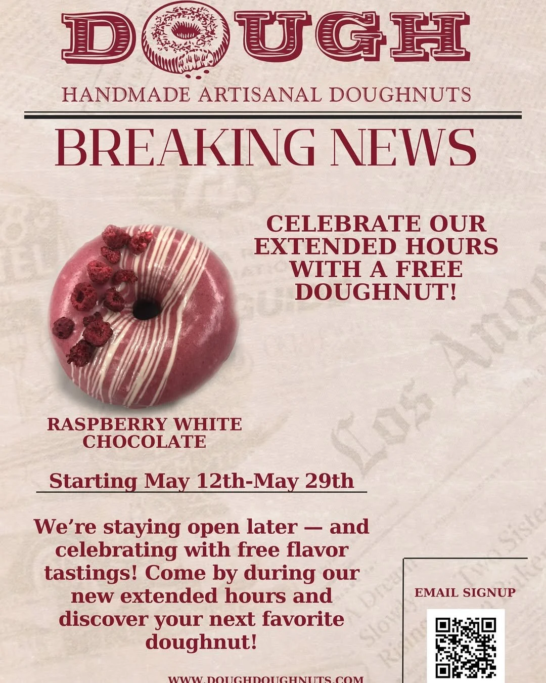 Deets: Dough Doughnuts is extending their hours! Come celebrate with a free doughnut! Stop by May 12-29 during their extended hours (7-8PM) to get a free raspberry white chocolate doughnut.