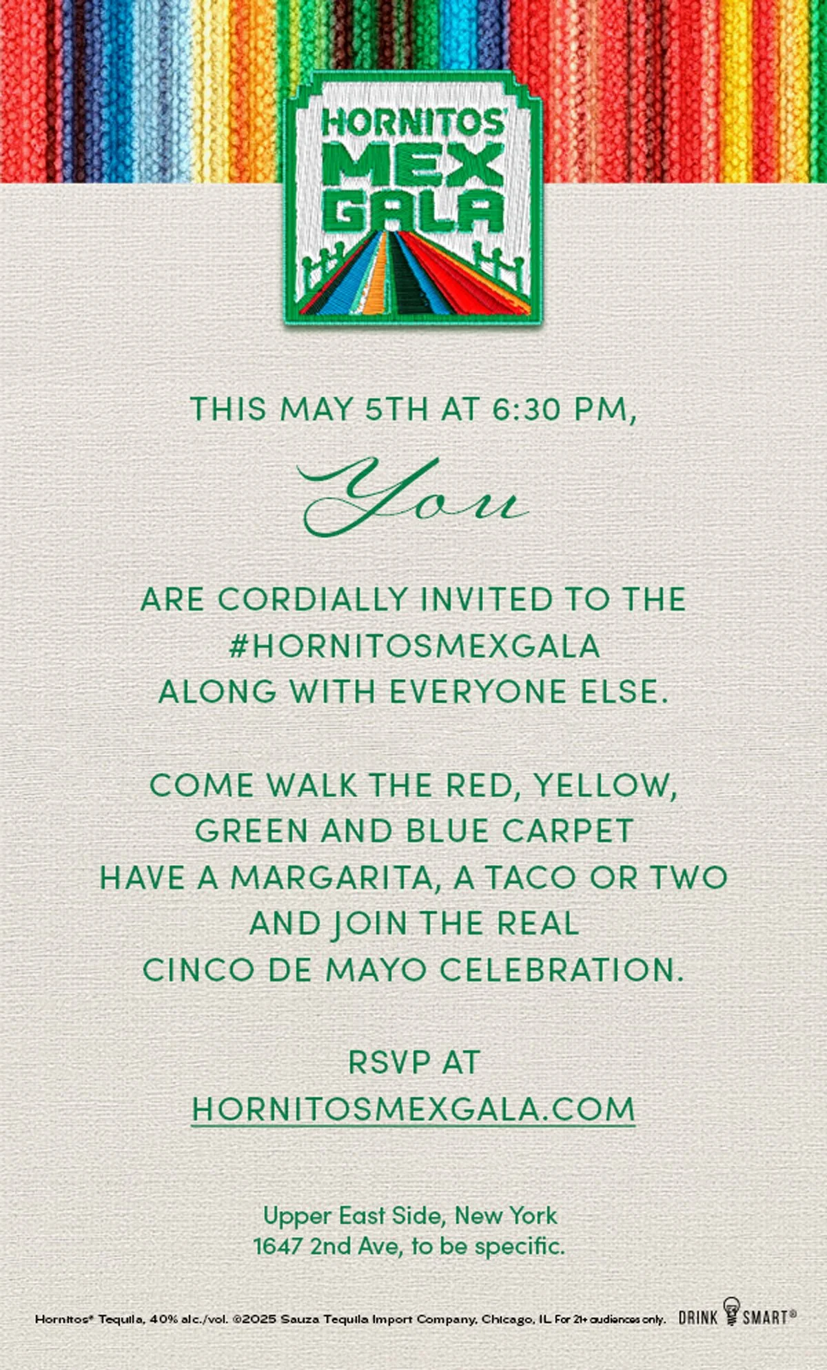 Deets: On behalf of Hornitos Tequila, we’re excited to invite you and everyone else to join us for the first-ever Hornitos Mex Gala on Monday, May 5th in the Upper East Side (1647 2nd Ave) in New York City! Hornitos Tequila is making sure everyone gets a front-row seat to the most inclusive event of the year!