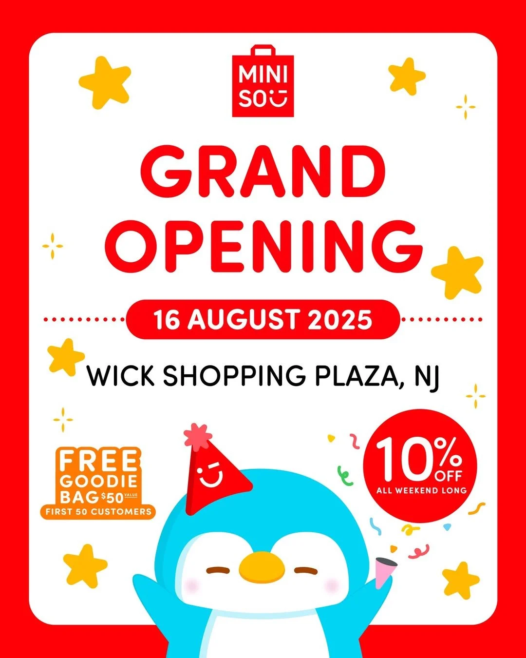 Deets: MINISO is having their Grand Opening in Edison, New Jersey on August 16th at 11AM! The first 50 customers receive FREE goodie bag valued at $50, as well as 10% OFF all weekend long!