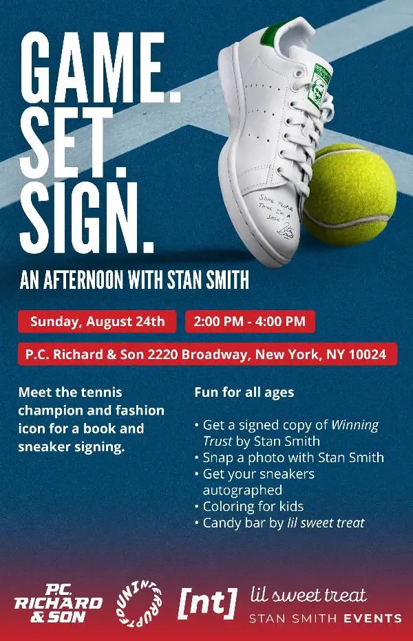 Deets: Join P.C. Richard the first day of the US Open for a special book and sneaker signing with Stan Smith. Bring the whole family (and your Adidas Stan Smiths!) for a chance to meet the man himself and get your sneakers signed. Other highlights include candy goodies provided by lil sweet treat, as well as a coloring station for kids.