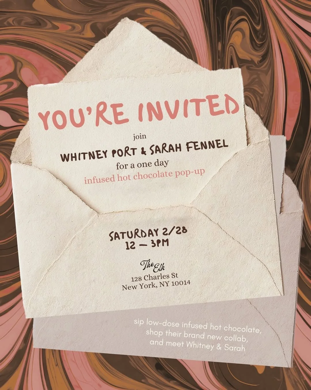 Deets: Join Sarah Fennel x Whitney Port for a hot chocolate pop-up at The Elk! Sarah Fennel and Whitney Port are taking over The Elk West Village for a one day pop up. They’ll be serving a low dose infused hot chocolate made with chocolate from their brand new line for The High Confectionary. This is a limited edition collaboration, available for one day only. Come grab a cup, hang out, and taste it first.