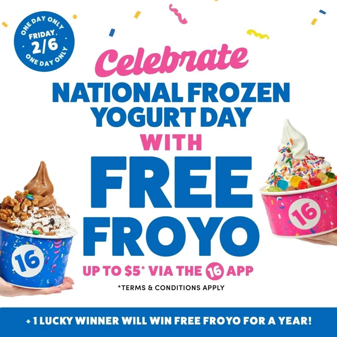 Deets: National Frozen Yogurt Day is 2/6, and 16 Handles is celebrating big. Get: