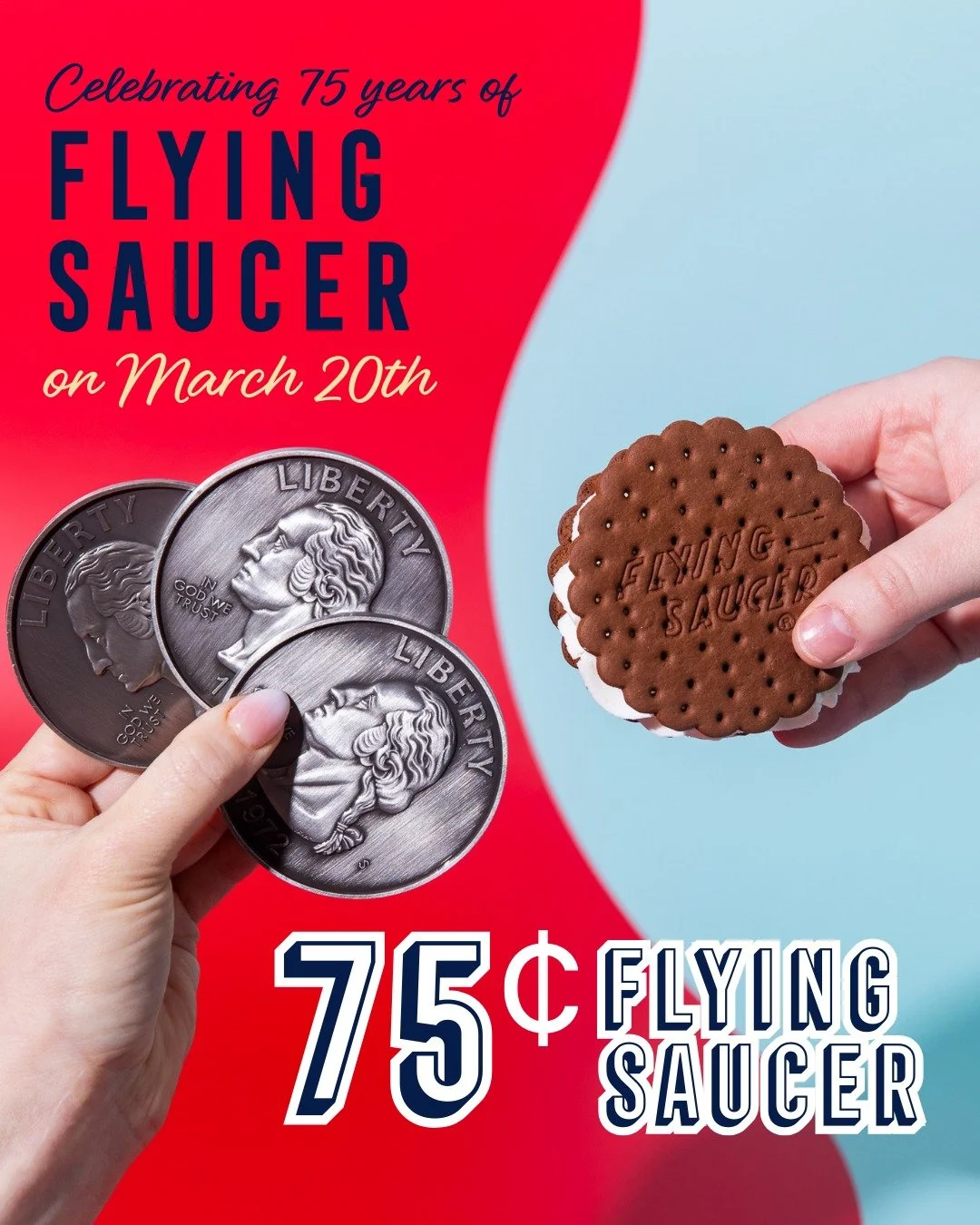 Deets: SAVE THE DATE! We are celebrating 75 years of Flying Saucers with $0.75 treats on Friday, March 20th 🛸 Don't miss this out of the world offer!