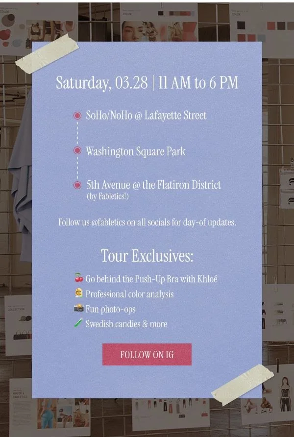 Deets: In honor of the Khloé x Fabletics launch, we’re excited to bring the collection to life with a special pop-up experience across NYC on March 28.