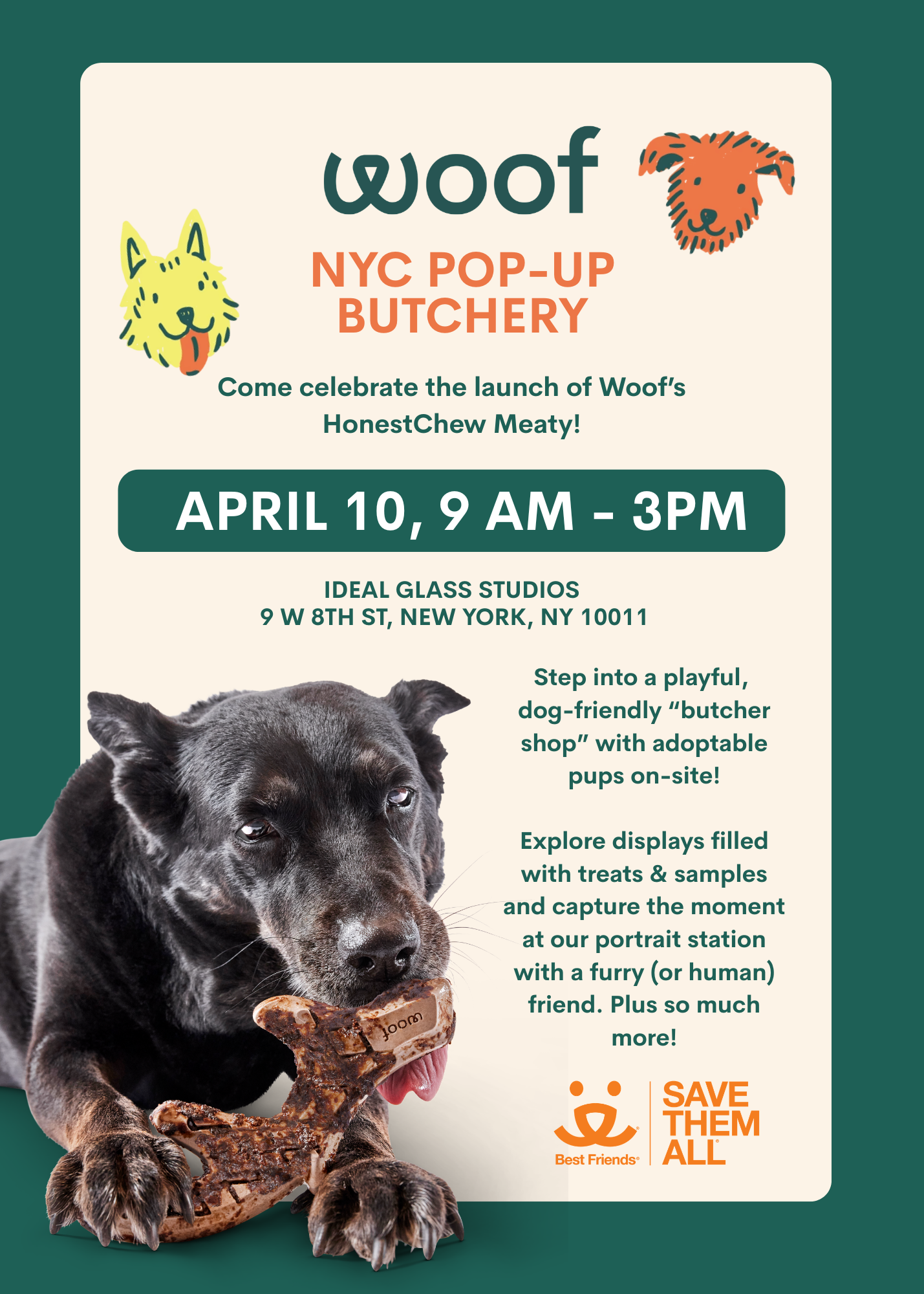Capture the moment at our portrait station with a furry (or human) friend. Bring old bones or meaty toys to be recycled by Woof, giving well-loved chew toys a second life. Adoptable dogs on site from Best Friends Animal Society NYC.